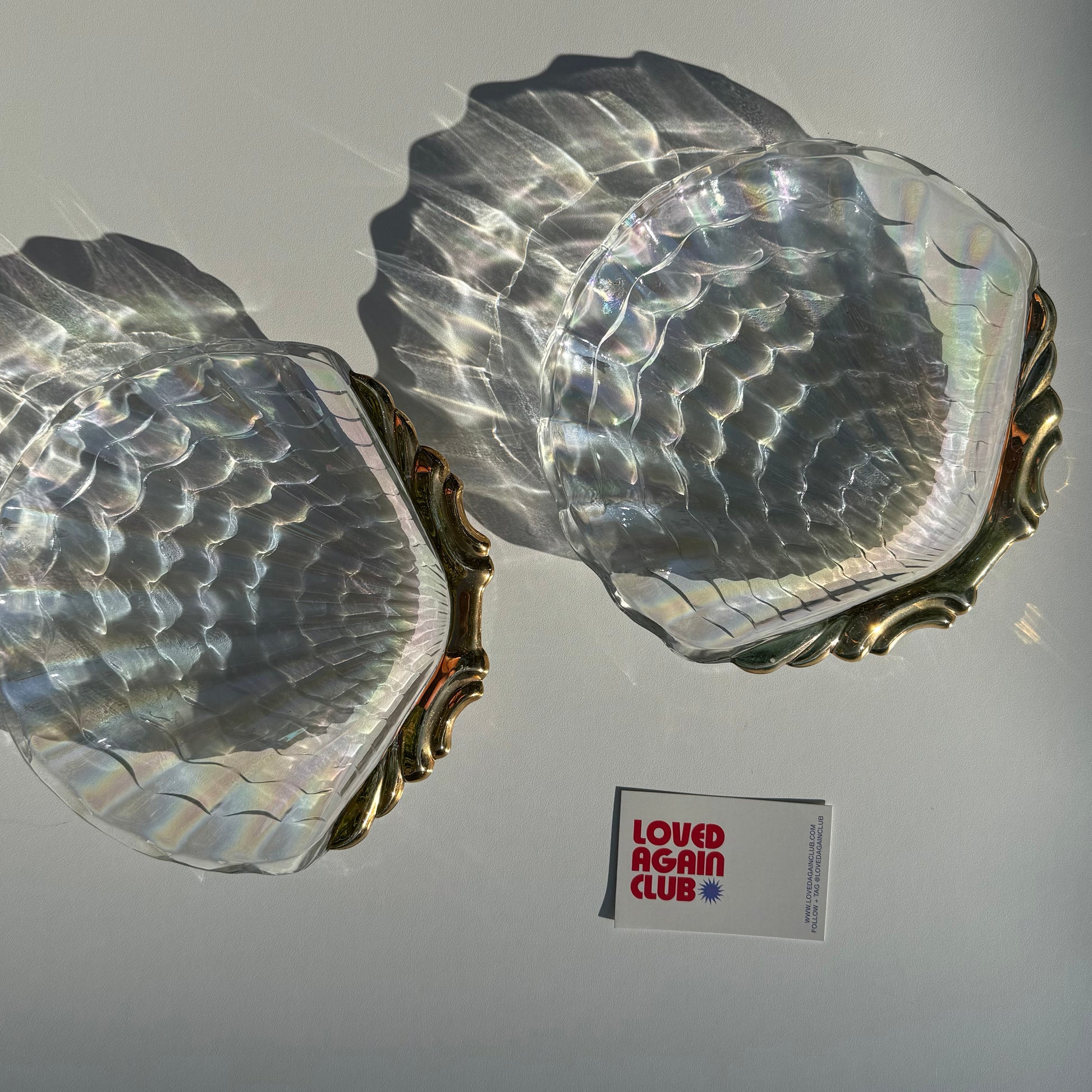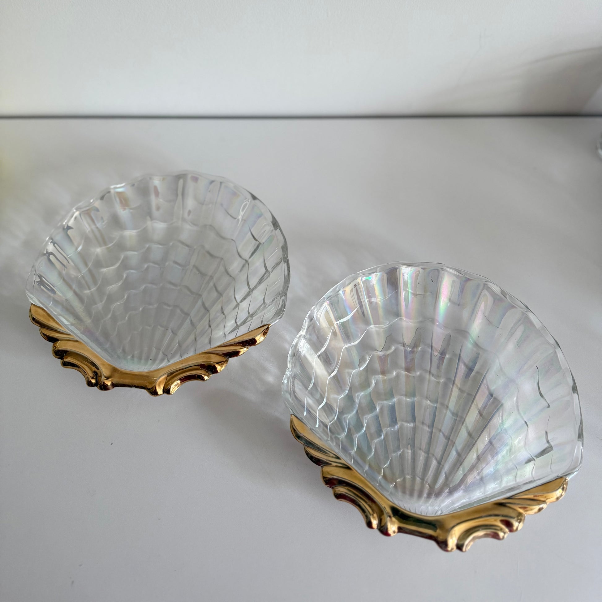 Set of two vintage Iridescent glass & gold shell plates